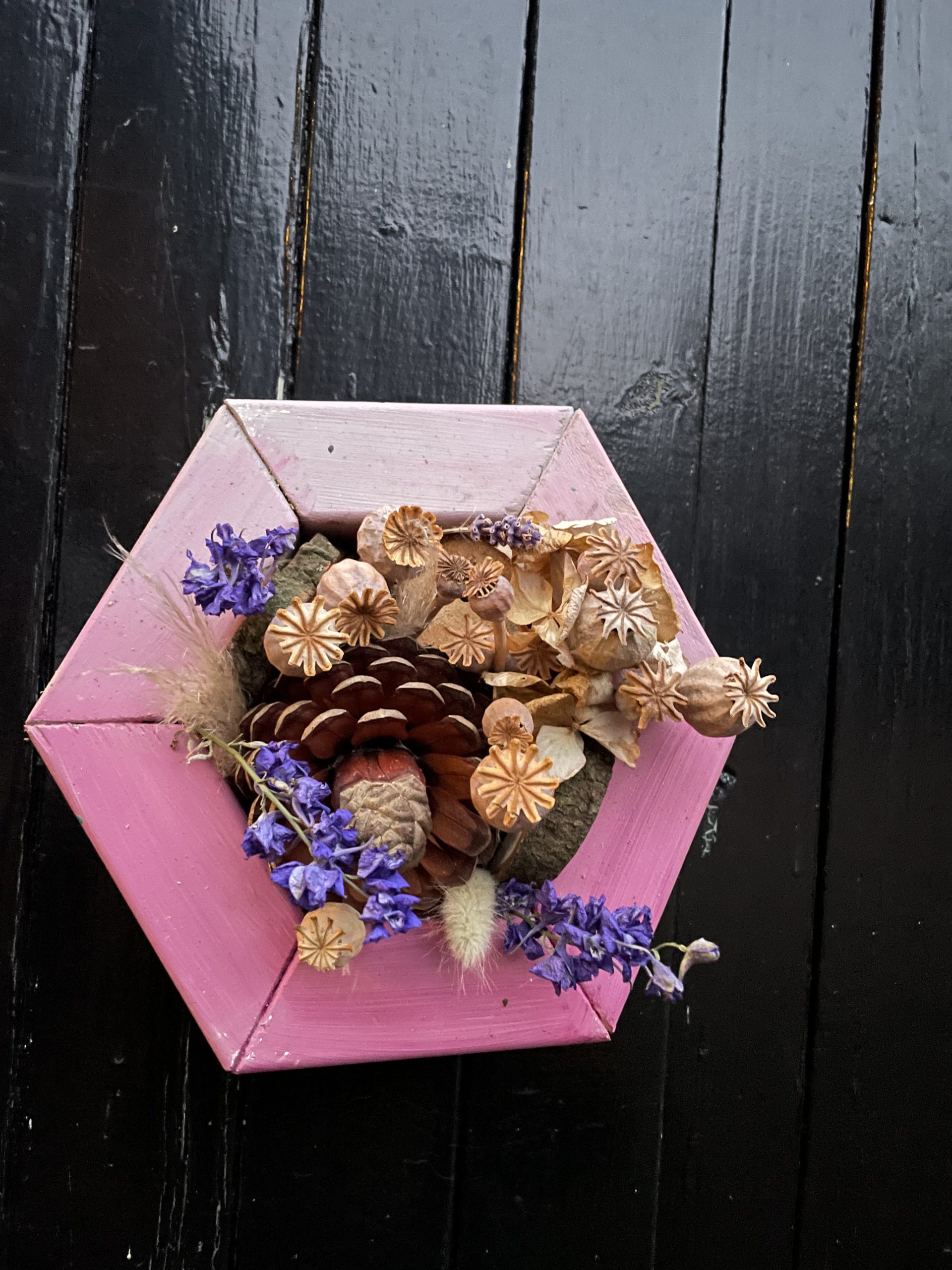Hexagon bee hotel, crafted from wood and designed to provide a cozy haven for solitary bees and insects amidst dried flowers.